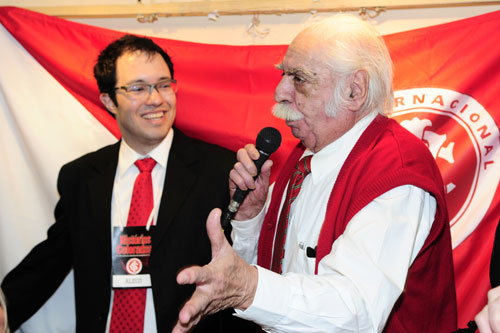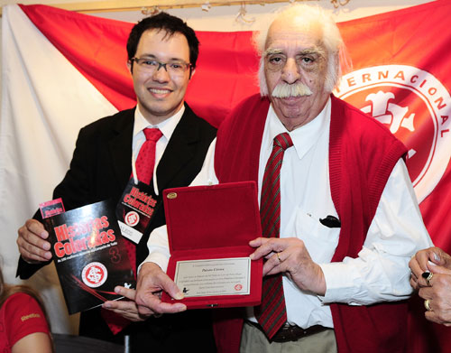 Paixão Côrtes (D), cônsul cultural do Inter, recebeu a homenagem do organizador do livro Aleco Mendes (E)