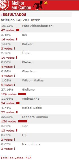 Com 150 votos, o centroavante Leandro Damião, destaque na reação do Inter para o empate contra o Atlético-GO, foi eleito o melhor jogador colorado da partida pelos internautas. O camisa 9 marcou um gol e ainda sofreu o pênalti que Giuliano converteu.