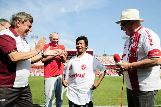 O Internacional fez uma bonita homenagem na tarde deste domingo (14/11) no gramado do Beira-Rio. A direção presenteou o índio guarani Onírio Acosta com uma camisa oficial do Inter na sua primeira visita ao estádio colorado. Acosta nasceu na Argentina e reside na Aldeia Mbya Guarani, na Ilha da Cotinga, no município de Paranaguá, berço da colonização do Paraná. Prestigiaram a singela homenagem os vice-presidentes do Clube Gelson Pires e Emídio Ferreira, além do diretor de marketing Jorge Avancini. "Transmita aos teus companheiros que o Internacional é o clube de todos os povos, credos e raças. Assim é a história centenária colorada desde o nascimento do Clube", disse Gelson Pires.