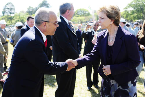 Governadora Yeda Crusius cumprimenta o dirigente colorado durante a solenidade