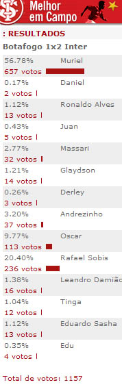 Responsável por grandes defesas que asseguraram a vitória no Engenhão, o golero Muriel foi escolhido pelos internautas colorados como o melhor jogador em campo contra o Botafogo. Veja os números da votação: