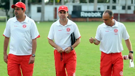 Jorge Macedo (E), ao lado de Enderson Moreira, técnico do Inter B, e Hilário Melo, preparador físico do time