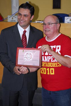 ploma e uma placa em agradecimento aos trabalhos prestados e às grandes conquistas do Clube dentro e fora de campo (foto ao lado). O cônsul de Caçapava, Manoel dos Santos Oliveira, e o presidente da torcida Sentinela Colorada, Aglae Santana, também foram homenageados durante a sessão solene.