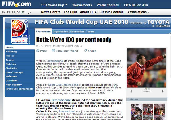 O técnico Celso Roth teve sua entrevista publicada no site da Fifa nesta quarta-feira. O título da matéria na página da entidade máxima do futebol foi formado com as palavras do treinador colorado: "Estamos 100% prontos". Roth fala ainda sobre os possíveis adversários no primeiro jogo do Mundial de Clubes e também avalia os grandes trunfos da equipe na luta pelo bicampeonato. Não deixe de conferir!