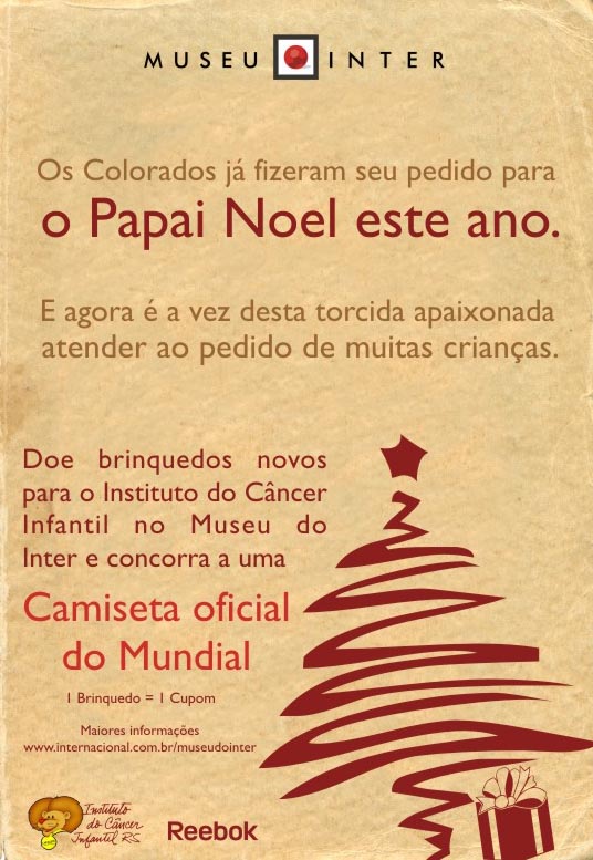 Venha visitar o Museu do Inter e colabore trazendo brinquedos novos que serão doados para o Instituto de Câncer Infantil. A cada brinquedo doado, você terá direito a um cupom para participar do sorteio de uma camiseta oficial do Mundial.