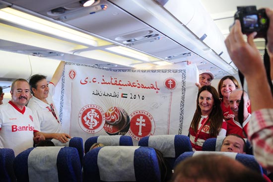 Localizados na parte traseira do avião, os fiéis colorados fizeram muita festa: entoaram cânticos, batucaram e exibiram faixas, como a que foi confeccionada pelo consulado de São Luiz Gonzaga-RS especialmente para esta jornada histórica em busca do bicampeonato mundial, que tinha o nome do Inter e do Mundial FIFA escritos com caracteres no estilo árabe. Os jogadores estavam acomodados na parte frontal, em uma área mais resguardada, mas nem por isso deixaram de sentir o clima de alegria que tomava conta do avião.