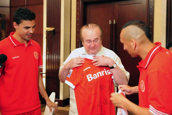 O dirigente máximo da Confederação Sul-Americana de Futebol recebeu os cumprimentos de todos os atletas colorados e, logo depois, Bolívar e Guiñazu o presentearam com duas camisas oficiais do Inter, modelo especial do Mundial, uma vermelha e outra branca, com autógrafos de todo o grupo.