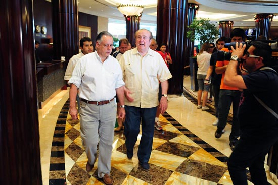 No detalhe, Fernanco Carvalho (E) e Nicolás Leoz no hotel do Inter em Abu Dhabi