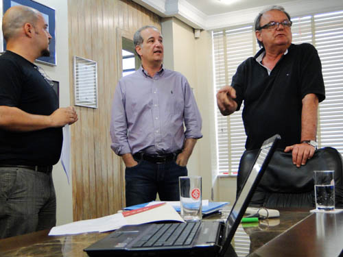 Tiago Vaz (E), presidente Giovanni Luigi (C) e ex-presidente Vitorio Piffero (D) conferiram detalhes do software