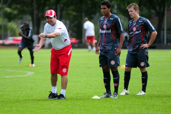 Treinador colorado orienta jogadores no treino desta terça-feira