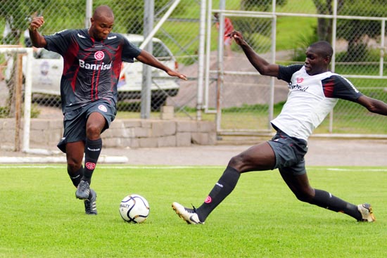 Bustos (E) tenta a jogada individual contra Leozão no treino tático desta quarta