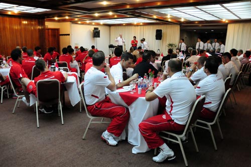 Tradicional em Bento Gonçalves, nas pré-temporadas do Inter, o jantar de confraternização entre jogadores e torcedores ocorreu na noite desta quinta-feira, aqui no hotel Dall'Onder. Com muita descontração, e ao som de música ao vivo, o encontro ainda contou com um discurso do presidente do Internacional, Giovanni Luigi, ao grupo colorado, desejando sorte contra os desafios que vêm pela frente. O vice-presidente de relações sociais, Gelson Pires, também marcou presença. A torcida aproveitou para tirar fotos com os jovens talentos do Clube. Destaque também para a diretoria do Consulado do Inter em Bento Gonçalves.