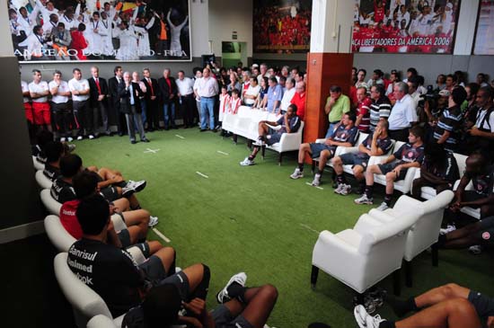 A reapresentação ocorreu na tarde desta quinta, no vestiário principal, onde os jogadores ficaram reunidos para acompanhar os discursos do presidente Giovanni Luigi e do vice-presidente de futebol Roberto Siegmann. "No final do ano quero que uma nova foto seja colocada na parede. Entraremos com toda força e vontade na luta pelo título da Libertadores, assim como do Brasileirão", disse Luigi, apontando para as imagens das conquitas da Libertadores (2006 e 2010) e da Copa Sul-Americana que estão afixadas nas paredes do vestiário.