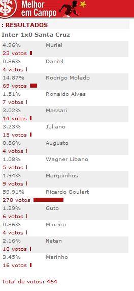 Com 464 votos, o meia Ricardo Goulart foi eleito pela torcida colorada como o destaque principal da vitória do Inter contra o Santa Cruz. Confira: