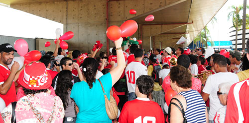 Sob um calor escaldante, cerca de 400 torcedores se aglomeraram em frente ao portão 5 do aeroporto, onde sem desanimar em nenhum instante cantaram sem cessar até o momento da aparição do jogador. A festa começou cedo, desde às 16h30 da tarde já havia concentração de torcedores no portão de desembarque. Balões, sinalizadores e bandeiras davam um colorido todo especial à festa preparada para receber ‘El Torito’. Inclusive, o jogador ganhou até um cântico. “Ohhh, Cavenaghi é gol”, bradavam os torcedores.
