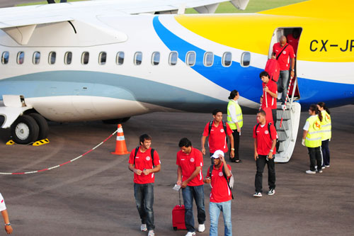 A delegação chegou nesta noite de sexta em Santana do Livramento, divisa com Rivera, após um voo tranquilo que veio direto de Porto Alegre. Antes, o grupo fez um treinamento fechado pela manhã, no campo principal do Beira-Rio. Os jogadores se reapresentaram pela tarde e partiram rumo ao aeroporto.