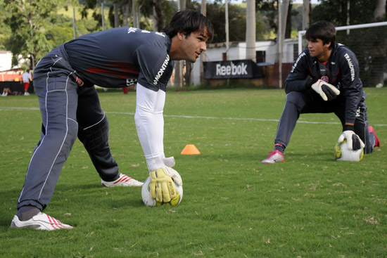 Muriel (E) aquece ao lado do irmão Alisson antes do treinamento do Inter B nesta segunda