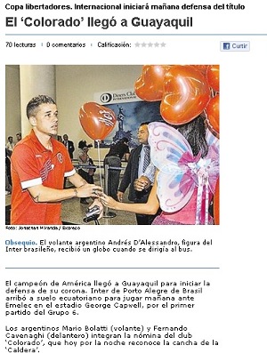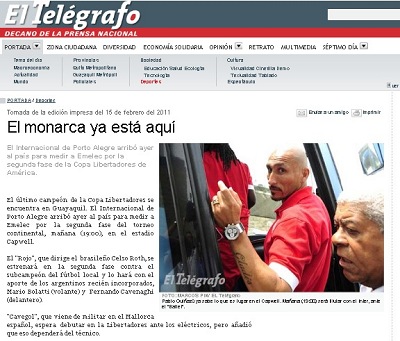 O diário El Telégrafo, de Guayaquil, trata o Inter no titulo da matéria como "o rei". O destaque da notícia relembra que o clube gaúcho é o atual campeão continental e exalta as mais recentes contratações: os argentinos Cavenaghi e Bolatti.