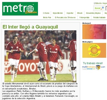 Quito, capital equatoriana, também está com a atenção voltada para o Inter. O diário Metro Hoy conta o assédio recebido pelos jogadores colorados no aeroporto de Guayaquil, destacando especialmente os argentinos D'Alessandro e Guiñazu. Outra informação é das bilheterias do George Capwell , que ficarão abertas nesta terça das 12h às 18h (horário local).