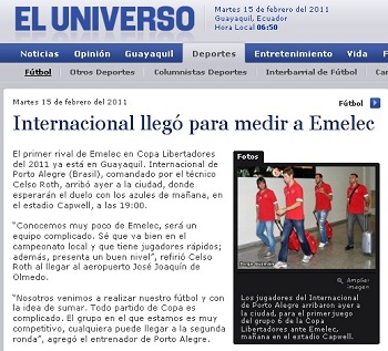Outro jornal de Guayaquil, o El Universo, publicou a notícia sobre a chegada do Inter ao Equador. O veículo ainda noticiou um amistoso realizado ontem pelo Emelec contra o Rocafuerte F.C, em que perdeu por 2 a 1. O gol do adversário colorado foi anotado pelo atacante argentino Eial Strahman.
