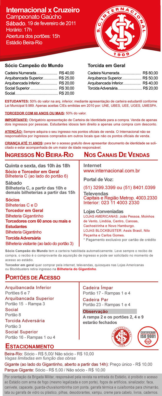 ATENÇÃO: Este será o último jogo com Social Superior. A partir da partida entre Inter e Jaguares (23/02), pela Libertadores da América, este setor deixará de existir, em virtude das obras de modernização do Beira-Rio e necessidade de atender Patrocinadores e Conmebol.