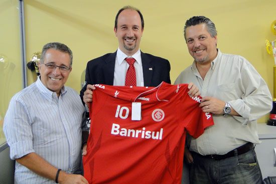 Jorge Avancini (E) e Rogério Ribeiro (D) entregando uma camisa ao diretor da QI, Henrique Gerstner