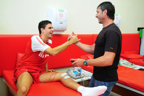 Pato (D) brinca com D'Alessandro, que se recupera de lesão na sala de fisioterapia do Inter