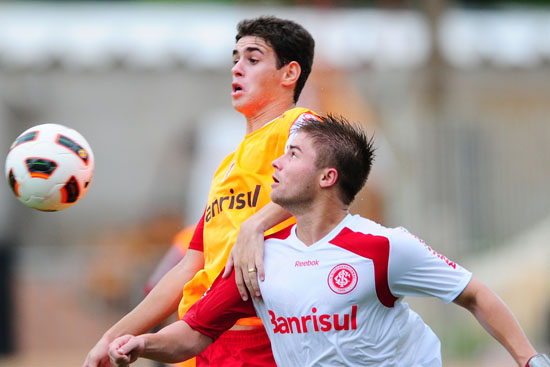 Oscar (E) disputa com Sasha a bola pelo alto no treino desta sexta