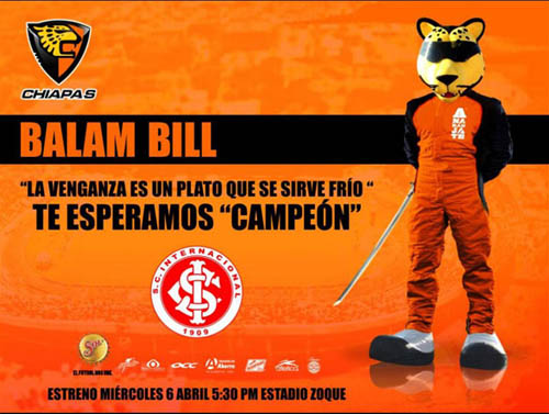 Prova disso é que o clube estampou em seu site oficial uma provocação ao Inter. Escrito em espanhol, o texto dizia: “Balam Bill. A vingança é um prato que se serve frio. Te esperamos campeão (SIC)”. A chamada também continha o mascote do clube, um jaguar, segurando uma espada e vestindo uma roupa alusiva ao filme Kill Bill, de Quentin Tarantino, além do símbolo do Inter logo abaixo. Vale lembrar que no jogo de ida o time colorado goleou os mexicanos por 4 a 0 no Beira-Rio.