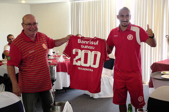 O volante colorado completou duas centenas de jogos com a camisa do Internacional na partida contra o Jaguares, pela quinta rodada da Libertadores. Após o almoço desta quinta, ainda no hotel onde o time está hospedado em Tuxtla Gutiérrez, Guiñazu foi presenteado pelo Clube com uma camisa oficial com o nome do jogador e o número 200 gravado às costas.