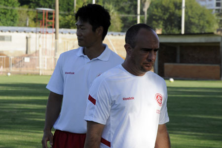 Shin (ao fundo) com o preparador físico do time júnior do Inter, Hilário Melo