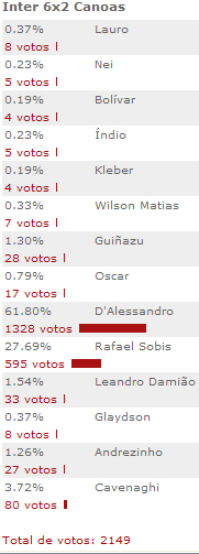 O meia D'Alessandro foi eleito o melhor jogador em campo na goleada sobre o Canoas, em enquete feita pelo site colorado. O jogador argentino, autor de dois gols na partida, recebeu mais de 60% dos votos. Confira os números da votação: