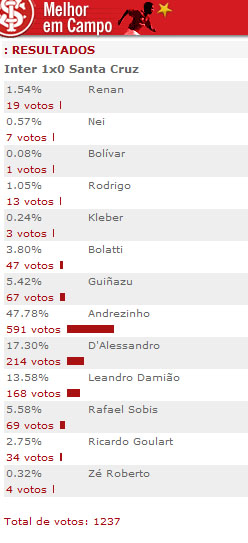 Na estreia de Falcão, quem brilhou dentro de campo para a torcida colorada foi o meia Andrezinho. Ele foi eleito o melhor jogador do Inter na vitória contra o Santa Cruz com 591 votos dos 1.237 contabilizados. Confira: