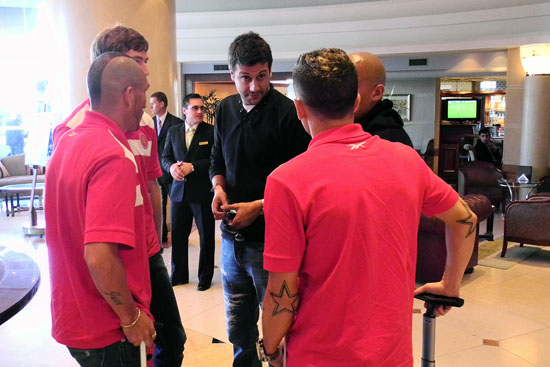 Parado por conta de uma lesão, o zagueiro uruguaio do Internacional, Sorondo, esteve no hotel Sheraton, da concentração colorada, aqui em Montevidéu, para recepcionar o grupo colorado. O jogador recupera-se em sua cidade natal da cirurgia feita no mês passado. O defensor cumprimentou todos e bateu um longo papo com os argentinos Guiñazu, D'Alessandro e Bolatti.