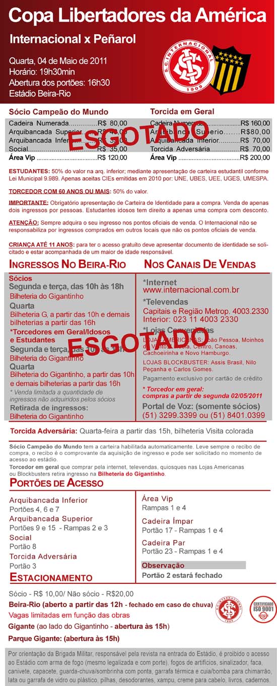 Ainda há ingressos para Internacional x Peñarol, na próxima quarta-feira, no Beira-Rio, mas só na Área VIP. A torcida colorada está motivada e esgotou praticamente todos os ingressos para o confronto que vale uma vaga às quartas de final da Copa Libertadores da América. Com um empate fora de casa por 1 a 1, o Inter pode empatar sem gols que, mesmo assim, garante classificação.