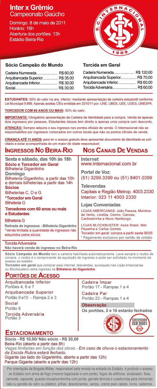Os torcedores colorados já podem adquirir o ingressos. Confira as informações abaixo: