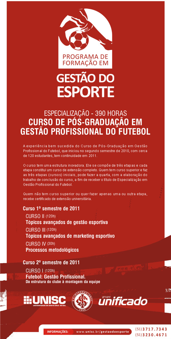 De olho nas exigências e oportunidades criadas pela Copa do Mundo de 2014 e Olímpiada de 2016, bem como na necessidade das agremiações esportivas em investir na profissionalização de seus recursos humanos, a promoção deste programa tem aceitação indiscutível. O curso, promovido pelo Internacional em parceria com a Universidade de Santa Cruz do Sul (Unisc) e o Grupo Educacional Unificado, e realizado no auditório da FECI no Gigantinho, veio realmente com a certeza de que o conhecimento de gestão esportiva se tornou uma demanda fundamental no Brasil.