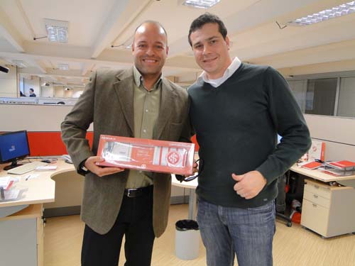 Martins Jorej Filho (E) recebeu seu prêmio do gerente de Licenciamento e Marcas do Clube, Rafael Saling (D)
