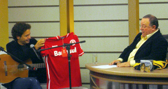 O cantor e compositor uruguaio Daniel Drexler foi presenteado pelo Internacional com uma camisa oficial na sua passagem por Porto Alegre. A entrega foi feita no programa Pedro Ernesto Entrevista, que foi ao ar na última quarta-feira (1/6) pela TVCOM. O artista se apresentou no mesmo dia no Theatro São Pedro, onde mostrou ao público o repertório do seu mais recente disco, Micromundo.