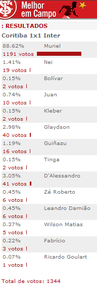 O goleiro Muriel foi eleito o melhor jogador em campo no empate com o Coritiba. A votação foi feita pelo site do Clube e contou com a participação de 1344 internautas. Muriel recebeu 88.62% dos votos.