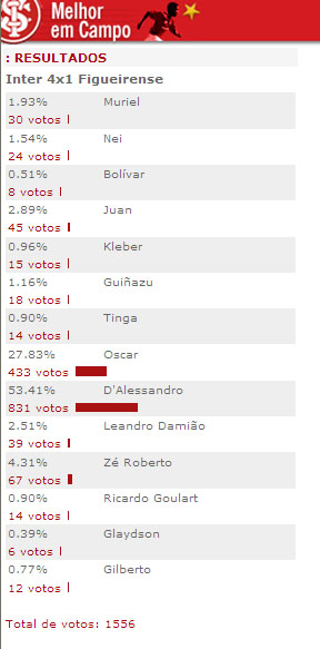 Com mais de 800 votos da torcida colorada, o meia D'Alessandro foi eleito o craque do jogo na goleada de 4 a 1 contra o Figueirense no domingo. Confira abaixo a enquete completa: