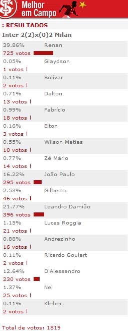 O goleiro Renan, reponsável por três defesas nas cobranças de pênaltis que decidiram o 3º lugar da Copa Audi contra o Milan, foi eleito pelos internautas colorados como o melhor jogador em campo em Munique, na Alemanha. Confira os números da votação realizada pelo site do Inter: