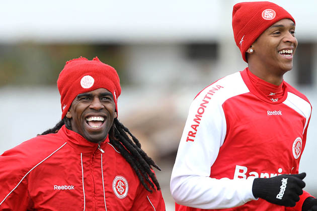 Tinga (E) e atacante Jô treinam sob baixa temperatura no Gigante (Jefferson Bernardes/Vipcomm)