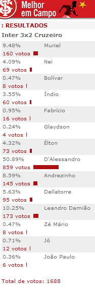 O meia-atacante foi eleito o melhor jogador em campo na vitória de 3 a 2 sobre o Cruzeiro, em enquete realizada pelo site do Inter. Autor do gol de empate, de pênalti, e do passe para o gol marcado por Leandro Damião, D'Alessandro recebeu 50,89% dos votos. Veja os números: