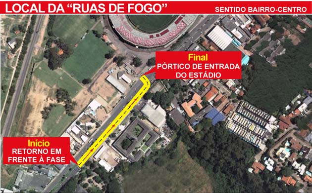 Antes da partida, às 20h15 de quarta-feira, está prevista a realização da ação 'Ruas de Fogo' (veja o mapa abaixo), que receberá a delegação colorada com uma vibrante festa logo na chegada ao Beira-Rio. Em acordo já firmado com a Brigada Militar e Empresa Pública de Transporte e Circulação (EPTC), os torcedores vão saudar o ônibus do time com sinalizadores vemelhos que irão traçar um caminho luminoso, a exemplo de como foi feito na semifinal da Libertadores de 2010, contra o São Paulo. Todas as torcidas estarão engajadas nesta impactante recepção.