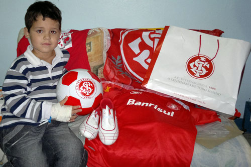 Willian Leite de Lima com os presentes do Internacional