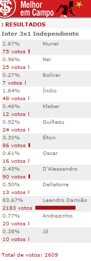 Talvez nem fosse necessário fazer a enquete do melhor jogador em campo na partida contra o Independiente, já que o resultado era previsível. Afinal, Leandro Damião teve uma atuação espetacular na final da Recopa, marcando dois gols que foram fundamentais na conquista do bicampeonato. Mesmo assim, o site do Inter apurou junto aos internautas, e não deu outra: o camisa 9 recebeu 83.67 % dos votos, sendo eleito o grande destaque da partida. Confira os números da votação: