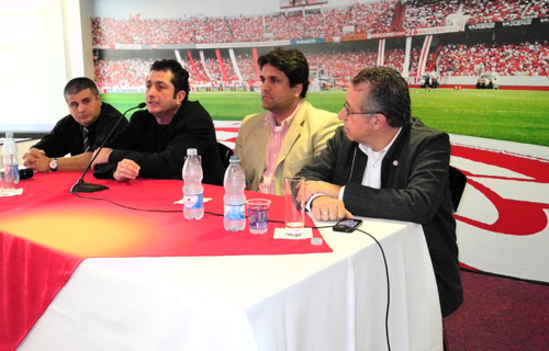 Luciano Davi fala na coletiva, ao lado de Norberto Guimarães (E), Fabio Cavalcanti e Jorge Avancini (D)