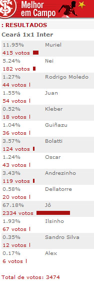 O atacante Jô, que marcou seu primeiro gol pelo Inter no empate em 1 a 1 com o Ceará, foi escolhido o melhor jogador em campo na partida válida pela segunda rodada do returno do Brasileirão. Confira os números da votação: