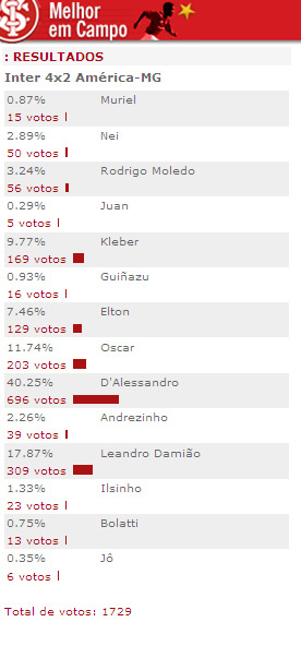 O meia D'Alessandro, autor do terceiro gol do Inter, foi eleito o melhor em campo na goleada sobre o América-MG por 4 a 2. Confira abaixo os números da enquete que teve mais de 1,7 mil votos.